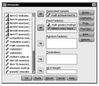 - Move the first independent variable, math grades, to the Fixed Factor(s) box and then move the second independent variable, father’s educ revised (not father’s education), to the Fixed Factor(s) box (see 9.1).