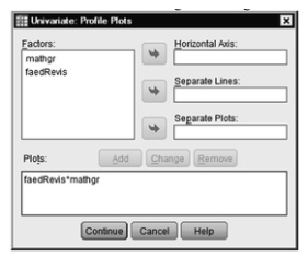 - Click on Plots and move faedRevis to the Horizontal Axis and mathgr to the Separate Lines box in 9.2. This “profile plot” will help you picture the interaction (or absence of interaction) between your two independent variables. Note, the plots will be easier to interpret if you put father’s educ revised with its three values on the horizontal axis and create separate lines for the variable (math grades) that has two levels.