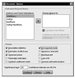 UNIANOVA mathach BY mathgr faedRevis /METHOD = SSTYPE(3) /INTERCEPT = INCLUDE