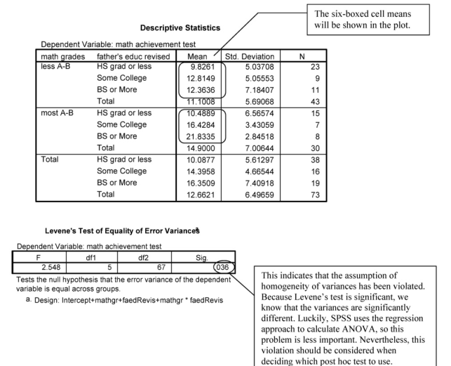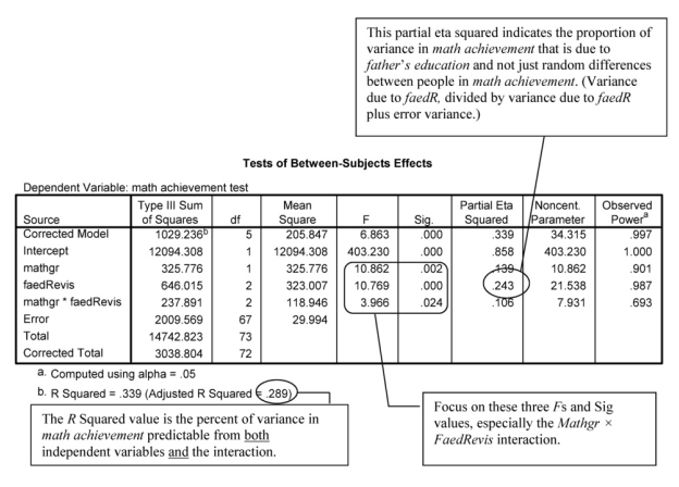 Now examine the main effects of math grades and of father’s education revised. Note that both are statistically significant, but because the interaction is significant this is somewhat misleading. The plots show that the effect of math grades does not seem to hold true for those whose fathers had the least education. Note also the callout boxes about the adjusted R squared and partial eta squared. Eta, the correlation ratio, is used when the independent variable is nominal and the dependent variable (math achievement in this problem) is scale. Eta is an indicator of the proportion of variance that is due to between-groups differences. Partial eta squared is the ratio of the variance associated with a particular between-groups “effect” to the sum of that same number (variance associated with that “effect”) and error variance. So it is a measure of reliable variance in the DV (math achievement in this case) that is associated with a particular between-groups “effect.” Adjusted R2 refers to the multiple correlation coefficient, squared and adjusted for number of independent variables, N, and effect size. Like r2, partial eta squared and R2 indicate how much variance or variability in the dependent variable can be predicted; however, the multiple R2 is used when there are several independent variables, and the r2 is used when there is only one independent variable. In this problem, the partial eta2 values for the three key Fs vary from .106 to .243 (you can take the square root of this to get partial eta, which in this case varies from