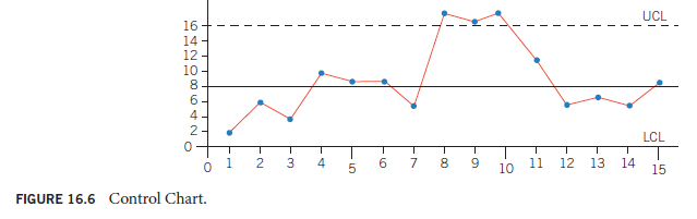 The performance of a process that operates consistently can be recorded and plotted on a control chart such as the one in Figure 16.6. The data points in this figure that fall within the control limits (i.e., between the upper control limit [UCL] and the lower control limit [LCL]) are likely to be related to common causes. The data points that fall outside the control limits are likely to be the results of a special cause of variation. In making decisions about the process in question, it is important to separate common and special causes of variation.