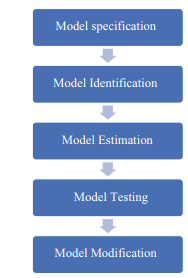- Model Specification: The first step in SEM analysis is the model specification. It is performed prior to data collection and data modelling. This involves the devel- opment of a theoretical model which defines the variables and their relationships based on the existing literature and This process is difficult, and hence, it is advised that the model must be grounded and derived from the existing litera- ture. The model should be well defined, and researcher should be able to explain the relationship in the model and the rationale of the overall model. The first step includes that the measurement model is specified with all the latent constructs.