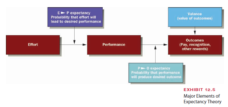 Elements of Expectancy Theory. Expectancy theory is based on the rela- tionship among the individual’s effort, the individual’s performance, and the desirability of outcomes associated with high performance. These elements and the relationships among them are illustrated in Exhibit 12.5. The keys to expectancy theory are the expectancies for the relationships among effort, performance, and the value of the outcomes to the individual.