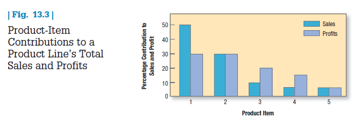 SALES AND PROFITS Figure 13.3 shows a sales and profit report for a five-item product line. The first item accounts for 50 percent of total sales and 30 percent of total profits. The first two items account for 80 percent of total sales and 60 percent of total profits. If these two items were suddenly hurt by a competitor, the line’s sales and profitability could collapse. These items must be carefully monitored and protected. At the other end, the last item delivers only 5 percent of the product line’s sales and profits. The product line manager may consider dropping this item unless it has strong growth potential.