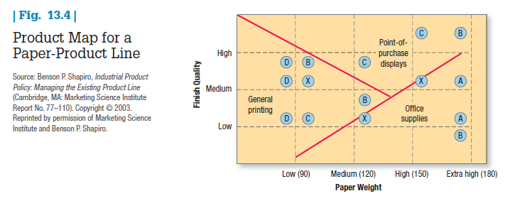 The product map also shows which competitors’ items are competing against company X’s items. For example, company X’s low-weight, medium-quality paper competes against competitor D’s and B’s papers, but its high- weight, medium-quality paper has no direct competitor. The map also reveals possible locations for new items. No manufacturer offers a high-weight, low-quality paper. If company X estimates a strong unmet demand and can produce this paper at low cost and price it accordingly, it could consider adding it to its line.