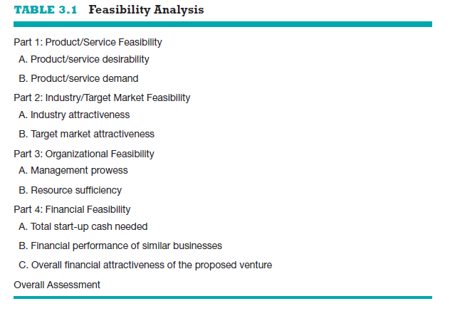 This chapter provides a methodology for conducting a feasibility analysis by describing its four key areas: product/service feasibility, industry/target market feasibility, organizational feasibility, and financial feasibility. We intro- duce supplemental material in two appendixes to the chapter. Appendix 3.1 contains a tool called First Screen, which is a template for completing a feasi- bility analysis. Appendix 3.2 contains an Internet Resource Table that provides information on Internet resources that are helpful in completing First Screen.