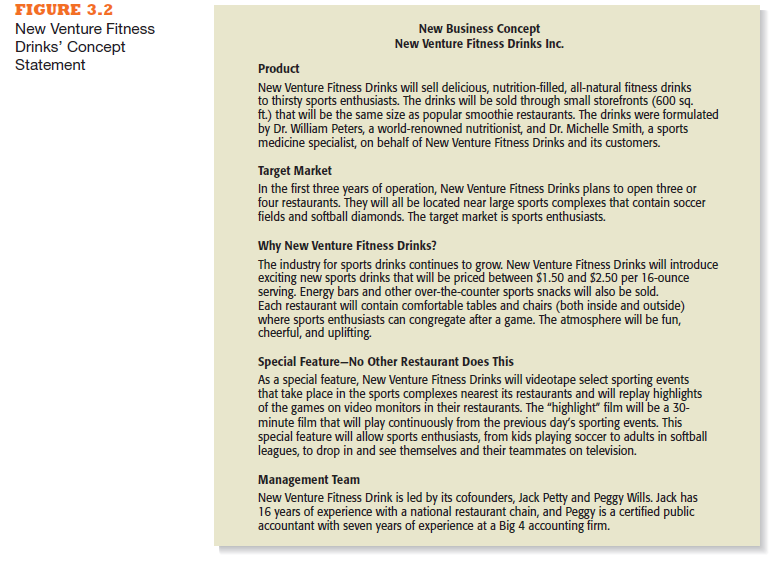 The concept statement for a fictitious company named New Venture Fitness Drinks is provided in Figure 3.2. New Venture Fitness Drinks sells a line of nutritious fitness drinks and targets sports enthusiasts. Its strategy is to place small restaurants, similar to smoothie restaurants, near large sports complexes. It is important to keep a concept statement relatively short (no more than one page) to increase the likelihood that it will be read. The concept statement is followed by a short buying intentions survey. The information gleaned from the survey should be tabulated and carefully read. If time permits, the statement can be used in an iterative manner to strengthen the product or service idea. For example, you might show the statement to a group of prospective customers, receive their feedback, tweak the idea, show it to a second group of customers, tweak the idea some more, and so on.