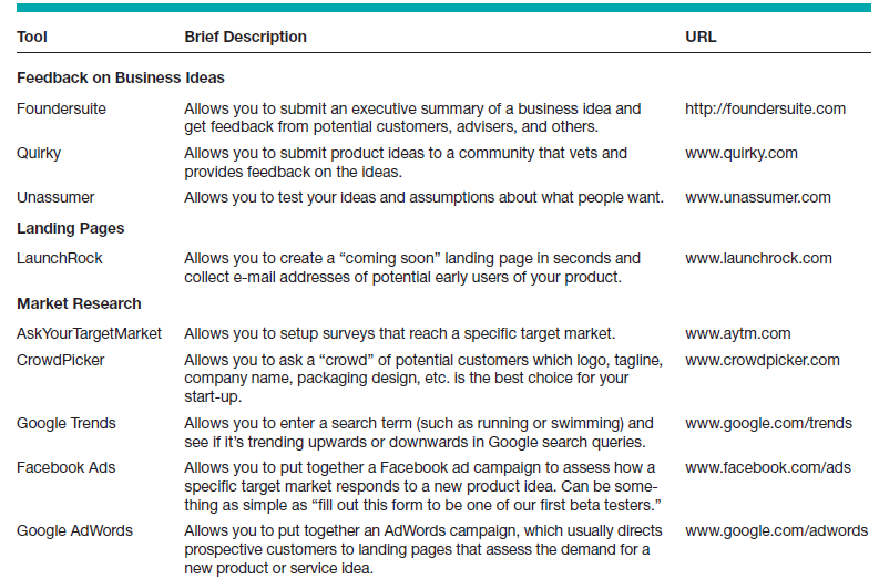 Rather than developing a formal concept statement, some entrepreneurs conduct their initial product/service feasibility analysis by simply talking through their ideas with prospective customers or conducting focus groups to solicit feedback. The ideal combination is to do both—distribute a concept statement to 20 or more people who can provide informed feedback and engage in verbal give-and-take with as many industry experts and prospective custom- ers as possible. There are also a growing number of online tools that help entre- preneurs quickly and inexpensively make contact with prospective customers and complete other steps in the feasibility analysis process. These tools range from services like Quirky, which provides direct feedback on product ideas, to 3D printing services like Shapeways, which converts CAD drawings of product ideas into physical prototypes that you can show to potential customers. We provide a sample of the online tools that are available in Table 3.2.