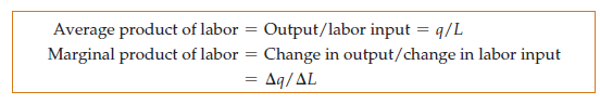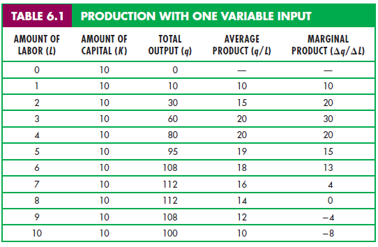 The contribution that labor makes to the production process can be described on both an average and a marginal (i.e.,incremental) basis. The fourth column in Table 6.1 shows the average product of labor (APL ), which is the output per unit of labor input. The average product is calculated by dividing the total output q by the total input of labor L. The average product of labor measures the productivity of the firm’s workforce in terms of how much output each worker produces on average. In our example, the average product increases initially but falls when the labor input becomes greater than four.