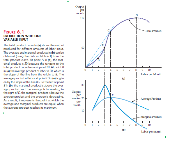 0C, the marginal product is the tangent to the total product curve at C (note the equality of the average and marginal products at point E in Figure 6.1 (b)). Finally, as we move beyond C toward D, the marginal product falls below the average product; you can check that the slope of the tangent to the total product curve at any point between C and D is lower than the slope of the line from the origin.
