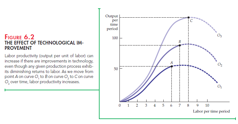 The law of diminishing marginal returns applies to a given production tech- nology. Over time, however, inventions and other improvements in technology may allow the entire total product curve in Figure 6.1 (a) to shift upward, so that more output can be produced with the same inputs. Figure 6.2 illustrates this principle. Initially the output curve is given by O1, but improvements in tech- nology may allow the curve to shift upward, first to O2, and later to O3.