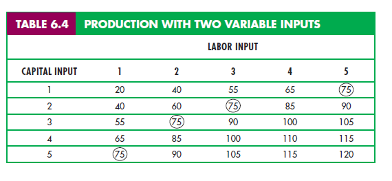 Let’s begin by examining the production technology of a firm that uses two inputs and can vary both of them. Suppose that the inputs are labor and capital and that they are used to produce food. Table 6.4 tabulates the output achievable for various combinations of inputs.