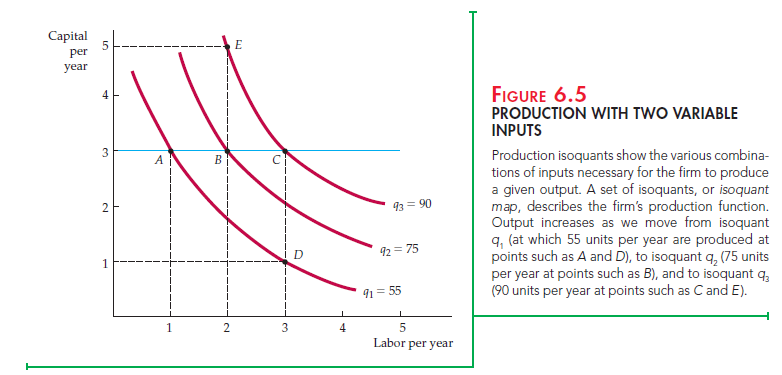 more labor and capital. Finally, isoquant q3 shows labor-capital combinations that yield 90 units of output. Point C, for example, involves 3 units of labor and 3 units of capital, whereas Point E involves 2 units of labor and 5 units of capital.