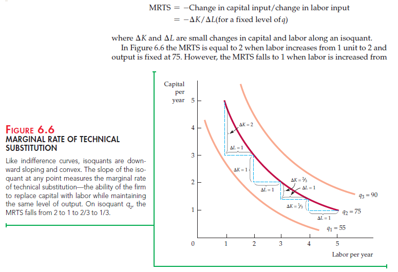 DIMINISHING MRTS We assume that there is a diminishing MRTS. In other words, the MRTS falls as we move down along an isoquant. The mathemati- cal implication is that isoquants, like indifference curves, are convex, or bowed inward. This is indeed the case for most production technologies. The dimin- ishing MRTS tells us that the productivity of any one input is limited. As more and more labor is added to the production process in place of capital, the productivity of labor falls. Similarly, when more capital is added in place of labor, the productivity of capital falls. Production needs a balanced mix of both inputs.