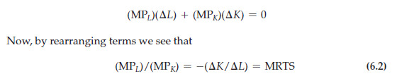 Equation (6.2) tells us that the marginal rate of technical substitution between two inputs is equal to the ratio of the marginal products of the inputs. This formula will be useful when we look at the firm’s cost-minimizing choice of inputs in Chapter 7.