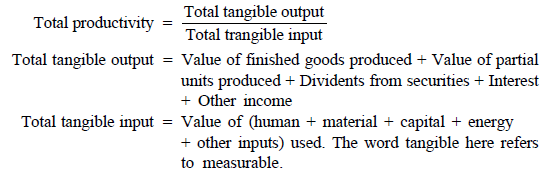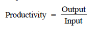 Productivity is the quantitative relation between what we produce and we use as a resource to produce them, i.e, arithmetic ratio of amount produced (output) to the amount of resources (input). Productivity can be expressed as: