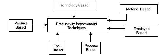 - Material and energy: Efforts to reduce materials and energy consumption brings about considerable improvement in productivity.