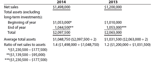 To illustrate, the ratio of net sales to assets for Lincoln Company is computed below. Total assets (excluding long-term investments) are $1,010,000 at the beginning of 2013.