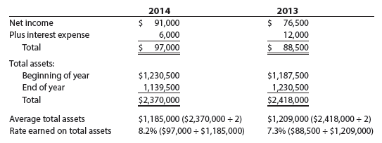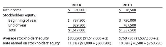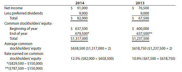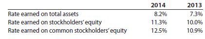 Lincoln Company’s rate earned on common stockholders’ equity improved from 10.9% to 12.5% in 2014. This rate differs from the rates earned by Lincoln Company on total assets and stockholders’ equity as shown below.