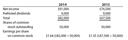 The price-earnings ratio improved from 20 to 25 during 2014. In other words, a share of common stock of Lincoln Company was selling for 20 times earnings per share at the end of 2013. At the end of 2014, the common stock was selling for 25 times earnings per share. This indicates that the market expects Lincoln to experience favorable earnings in the future.