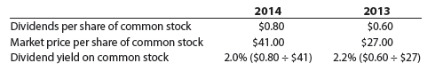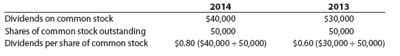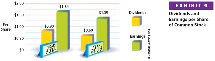 The dividends per share of common stock increased from $0.60 to $0.80 during 2014. Dividends per share are often reported with earnings per share. Comparing the two per-share amounts indicates the extent to which earnings are being retained for use in operations. To illustrate, the dividends and earnings per share for Lincoln Company are shown in Exhibit 9.