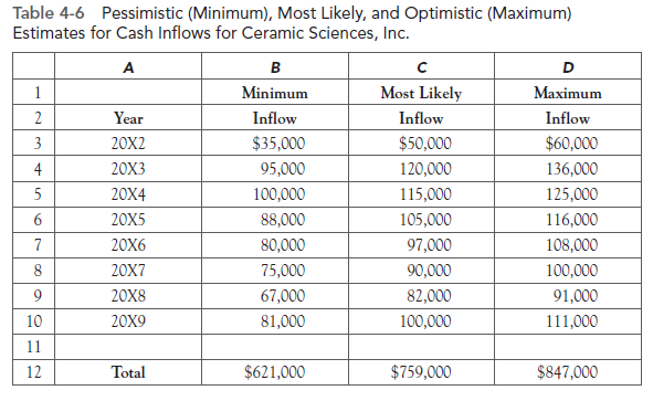 Table 4-7 Three-Point Estimate of Cash Flows and Inflation Rate for Ceramic Sciences, Inc. All Assumption and Forecast Cells Defined