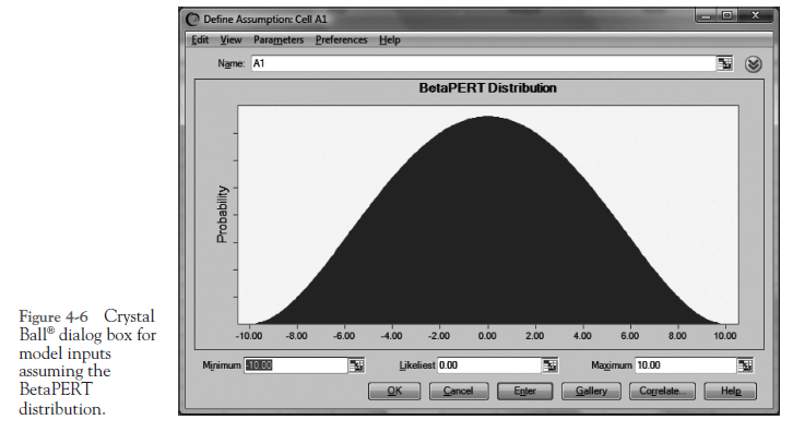 - CB’s BetaPERT Distribution dialog box is displayed as in Figure 4-6. It may have numbers in the boxes but ignore them. If it does not otherwise appear exactly like Figure 4-6, click “Parameters” on the menu at the top of the BetaPERT Distribution dialog box, and then select “Minimum, Most Likely, Maximum” at the top of the drop’down menu.