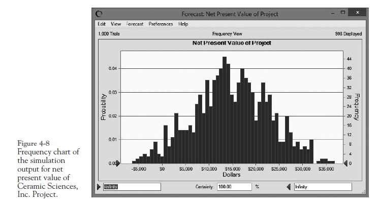 Figure 4-9 contains some interesting information. There are, however, several questions that are more easily answered by using Figure 4-8, the distribution of the simulation’s outcomes. What is the likelihood that this project will achieve an NPV at least $10,000 above the hurdle rate including inflation? It is easy to answer this question. Note that there are black triangles at either end of the baseline of the distribution in Figure 4-8. By placing the cursor on the triangle on the left end of the simulation distribution baseline and sliding it to the $10,000 mark, the probability of a $10,000 or greater outcome can be read in the “Certainty” box. One can also find the same answer by deleting the “-Infinity” in the box in the lower left corner of the Frequency View and entering $10,000 in it.