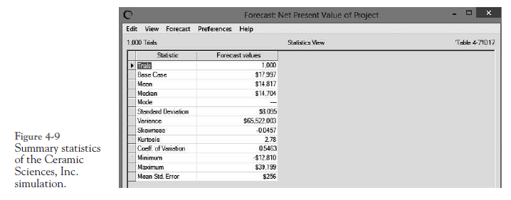 The distribution of NPVs resulting from simulating this project 1,000 times is displayed in Figure 4-8. Statistical information on the distribution is shown in Figure 4-9. The NPVs had a mean of $14,817 and a standard deviation of $8,095. We can use this information to make probabilistic inferences about the NPV of the project such as what is the probability the project will have a positive NPV, what is the probability the project’s NPV will exceed $10,000, or what is the probability the project’s NPV will be between $5,000 and $10,000?