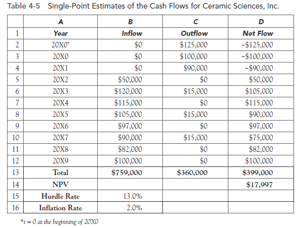 Table 4-7 Three-Point Estimate of Cash Flows and Inflation Rate for Ceramic Sciences, Inc. All Assumption and Forecast Cells Defined
