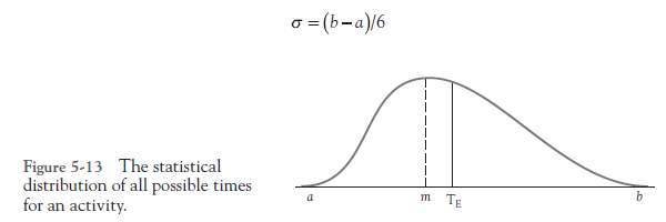 First, it is necessary to define what is meant by the terms “pessimistic,” “optimistic,” and “most likely” (or “normal”). Assume that all possible durations (or all possible costs) for some task can be represented by a statistical distribution as shown in Figure 5-13. The individual or group making the estimates is asked for a task duration, a, such that the actual duration of the task will be a or lower approximately 3 times out of 1,000 times. Thus a is an optimistic estimate. The pessimistic estimate, b, is an estimated duration for the same task such that the actual finish time will be b or greater approximately 3 times out of 1,000 times. (These estimates are often referred to as the “almost never level.”) The most likely or normal duration is m, which is the mode of the distribution shown in Figure 5-13.