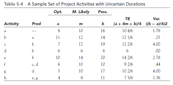 Table 5-4 shows a set of tasks, their predecessors, and optimistic, most likely, and pessimistic durations for each activity, plus the expected time and activity duration variance. (If the project had been more realistic, that is, much larger, we would have used an Excel® spreadsheet to handle all the calculations.)