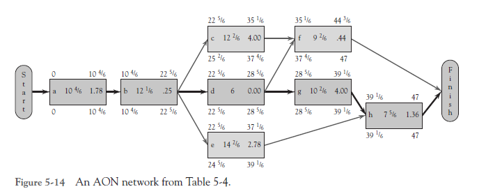 When two or more paths through a network join, even at the end of the network, paths that have little slack and/or high variance may become critical simply by chance. For example, examine path a-b-c-f in Figure 5-14, a path with an expected duration of 44.5 days and a path variance of 6.47 days. What is the chance that this path could be longer than our expected project completion time of 47 days?