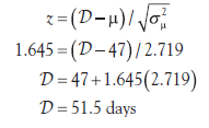 This is the same problem solved just above, but now D, the desired date, is the unknown while the probability associated with z is preset at .95. Referring to the table with cumulative probabilities for the normal distribution on the inside back cover we can see that for a .95 probability, z will have a value of 1.645. Therefore,