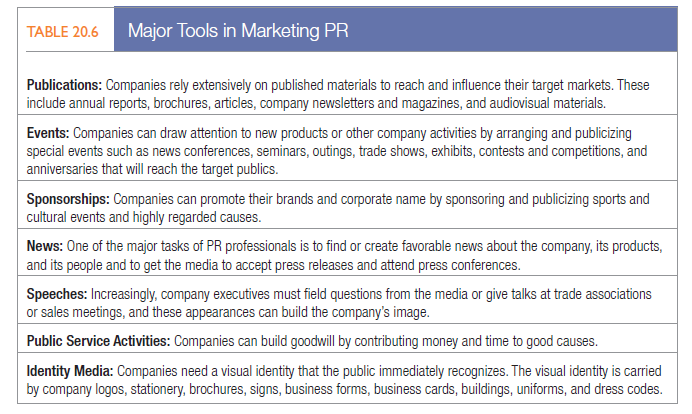 In considering when and how to use MPR, management must establish the marketing objectives, choose the PR messages and vehicles, implement the plan, and evaluate the results. The main tools of MPR are described in Table 20.6.