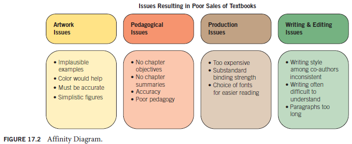 Figure 17.2 is an affinity diagram developed by the publisher’s QFD team. With it, the goal was to organize the customer input (both what they want that the publisher didn’t offer and what they did not like about the current books) to clarify the reasons the books were not selling well. The result will be a categorized list of customers’ issues, which can then be reviewed and analyzed. Such affinity diagrams are developed through these steps: