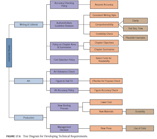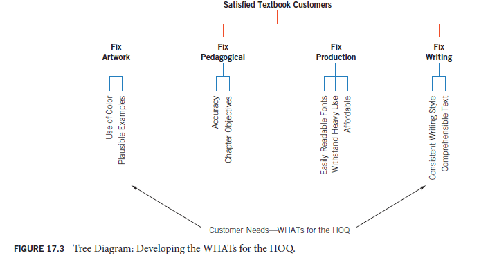 - Figure 17.3 is a partial tree diagram that was developed to address the issues identified in Figure 17.2. We have deliberately oversimplified our tree diagram to keep the HOQ construction easier to follow. Notice that the team’s choice of things that must happen to make our textbook artwork acceptable to customers includes the use of color in the artwork and ensuring that examples are plausible. These two items represent the abbreviated customer needs with respect to our artwork issues.
