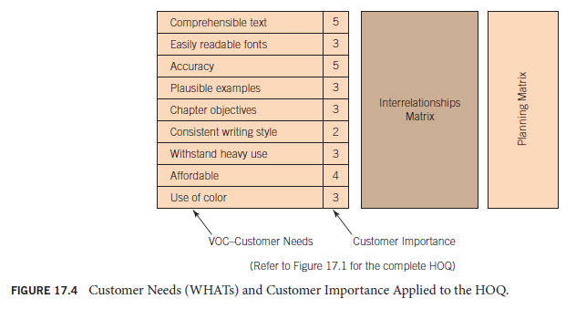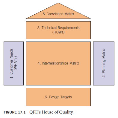 The heart of QFD is the set of interrelated matrices known as the House of Quality (HOQ), so named because the complete matrix takes on the appearance of a house. Examining Figure 17.1 you will see that the HOQ is made up of six submatrices. The HOQ is utilized by a multifunctional QFD team (1) to take input requirements from the customers, and translate them into a set of customer needs, known in the QFD world as the “voice of the customer” and (2) from the VOC, and some benchmarking with competing products, determine the prioritized features of a new (or improved) product or service that will best respond to the VOC.