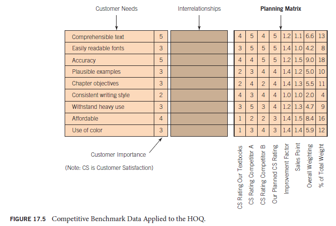 Also plotted on the Planning matrix will be the team’s desired customer satisfaction performance for the new product for each of the customer needs. The same 1 to 5 scale is used. One might ask, why wouldn’t the team desire the best rating (5) for every need? The reason the company has to back off perfection is money. The practical objective is to produce a textbook that will satisfy customers while not pricing itself out of the market. That is not to say that improvements should not be made if they can be done without putting the book out of reach of its prospective customers or making the book uncompetitive for cost reasons in the market. The publisher would like to be the competitive leader, but not necessarily the most expensive producer.