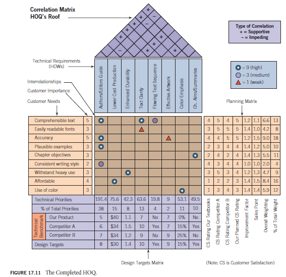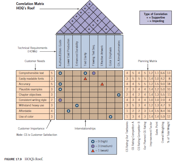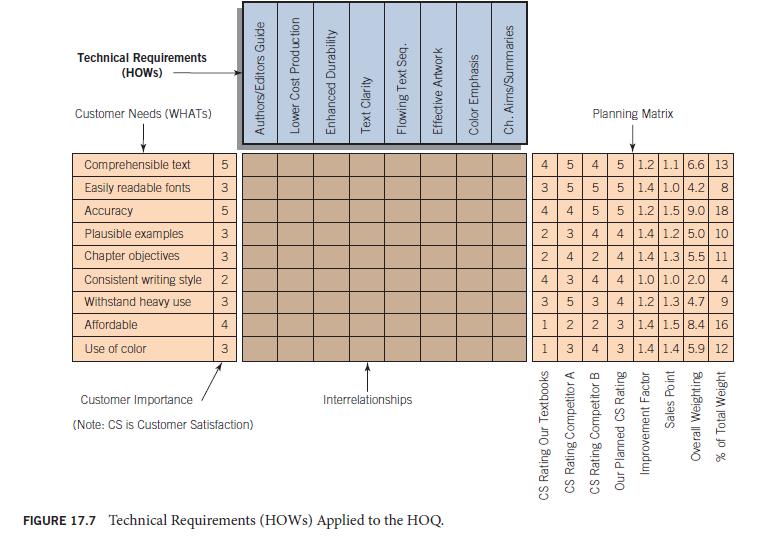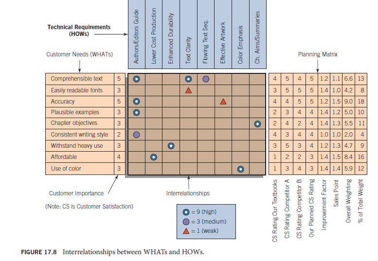 To determine the relative importance, or priorities, of each of the stated technical requirements (HOWs) in meeting the customer needs (WANTs), the QFD team simply multiplies each of the interrelationship ratings of the technical requirement (0, 1, 3, or 9) from the Interrelationships matrix times the corresponding customer need’s overall weighting value in the Planning matrix, and then sums the columns. All of the data for these calculations are already in the HOQ of Figure 17.9. Starting with the technical requirement for a new and responsive set of Authors/Editors Guide, we find that its relationship to the customer need for a comprehensible text was indicated in the Interrelationships matrix as a 9. Looking across the row to the Overall Weighting column of the Planning matrix we find a value of 6.6. Multiplying them gives us a value of 59.4.