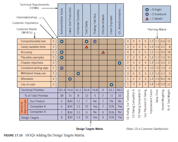 The design goal for having artwork that is effective in clarifying and illuminating the text was elevated from the current level of 7 to a 9, the same as leading Competitor B. The target for color emphasis was set at having 15% of the pages with some use of color. That is much less than Competitor B, but in line with the customer’s needs. And finally, the team determined that the publisher must include chapter aims or objectives and chapter summaries in its books. This is indicated as a YES. See Figure 17.10 for all the inputs to the Design Targets matrix.
