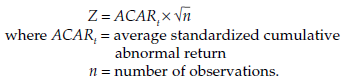 McWilliams and Siegel (1997) emphasize the precautions that must be taken with such types of analysis. First, the sample should be reasonably large, as the test statistics used are based on normality assumptions. Moreover, OLS regressions are very sensitive to outliers, which should therefore be identified, especially if the sample is small. Another major difficulty concerns the length of the event window. It should be as short as possible, to exclude disruptive elements, external to the study, while still remaining long enough to capture the impact of the event. Finally, the abnormal returns should be justified theoretically.
