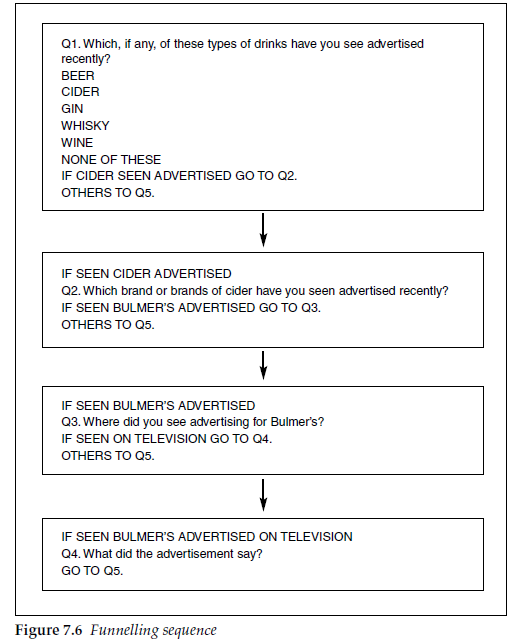 Typically in the funnelling sequence, whether respondents are asked a question depends on their response to the previous one. This means that people for whom questions are irrelevant can be routed round them. Because people are routed out without knowing what the criteria are for continuing the question sequence, we can be more confident that the response that we obtain to the final question is not biased. In the example in Figure 7.6, we would have little confidence that there was no bias had we asked the one question ‘If you have seen any advertising for Bulmer’s cider on television recently, what did it say?’ This question would lead to overclaiming of having seen advertising, because there is an assumption that Bulmer’s cider has been advertised on television recently. Some respondents would then claim to have seen it, even though they had not.