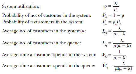 The assumptions here are: unlimited customers, unlimited waiting area, first-come-first-served, single server, arrival rate follows a Poisson distribution, and service time follows a negative exponential distribution. The formula calculations are: