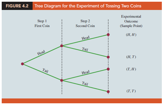 A tree diagram is a graphical representation that helps in visualizing a multiple-step experiment. Figure 4.2 shows a tree diagram for the experiment of tossing two coins. The sequence of steps moves from left to right through the tree. Step 1 corresponds to tossing the first coin, and step 2 corresponds to tossing the second coin. For each step, the two possible outcomes are head or tail. Note that for each possible outcome at step 1 two branches correspond to the two possible outcomes at step 2. Each of the points on the right end of the tree corresponds to an experimental outcome. Each path through the tree from the leftmost node to one of the nodes at the right side of the tree corresponds to a unique sequence of outcomes.