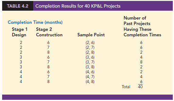 To perform further analysis on the KP&L project, we must develop probabilities for each of the nine experimental outcomes listed in Table 4.1. On the basis of experience and judgment, management concluded that the experimental outcomes were not equally likely. Hence, the classical method of assigning probabilities could not be used. Management then decided to conduct a study of the completion times for similar projects undertaken by KP&L over the past three years. The results of a study of 40 similar projects are summarized in Table 4.2.