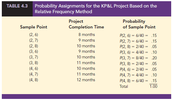 In using the data in Table 4.2 to compute probabilities, we note that outcome (2, 6)—stage 1 completed in 2 months and stage 2 completed in 6 months—occurred six times in the 40 projects. We can use the relative frequency method to assign a probability of 6/40 = .15 to this outcome. Similarly, outcome (2, 7) also occurred in six of the 40 projects, providing a 6/40 = .15 probability. Continuing in this manner, we obtain the probability assignments for the sample points of the KP&L project shown in Table 4.3. Note that P(2, 6) represents the probability of the sample point (2, 6), P(2, 7) represents the probability of the sample point (2, 7), and so on.