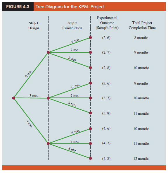 Because this project has three possible completion times for the design stage (step 1) and three possible completion times for the construction stage (step 2), the counting rule for multiple-step experiments can be applied here to determine a total of (3)(3) = 9 experimental outcomes. To describe the experimental outcomes, we use a two-number notation; for instance, (2, 6) indicates that the design stage is completed in 2 months and the construction stage is completed in 6 months. This experimental outcome results in a total of 2 + 6 = 8 months to complete the entire project. Table 4.1 summarizes the nine experimental outcomes for the KP&L problem. The tree diagram in Figure 4.3 shows how the nine outcomes (sample points) occur.