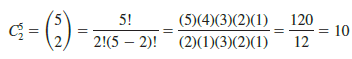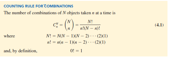 As an illustration of the counting rule for combinations, consider a quality control procedure in which an inspector randomly selects two of five parts to test for defects. In a group of five parts, how many combinations of two parts can be selected? The counting rule in equation (4.1) shows that with N = 5 and n = 2, we have