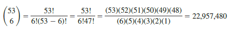 As another example, consider that the Florida Lotto lottery system uses the random selection of 6 integers from a group of 53 to determine the weekly winner. The counting rule for combinations, equation (4.1), can be used to determine the number of ways 6 different integers can be selected from a group of 53.